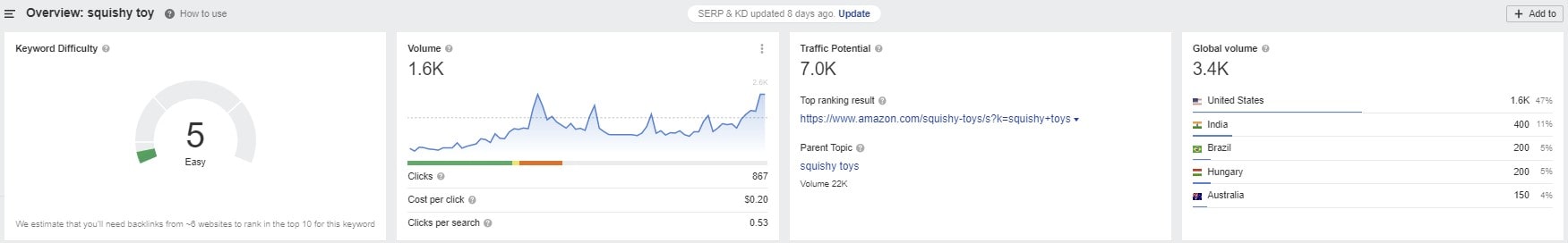 We may see that this keyword has a global search volume that amounts to more than 50K. At the same time, the keyword difficulty is extremely low. It means that you are highly likely to succeed in reselling this group of products. If you’re eager to open new horizons for your business, this product category is exactly what you need!