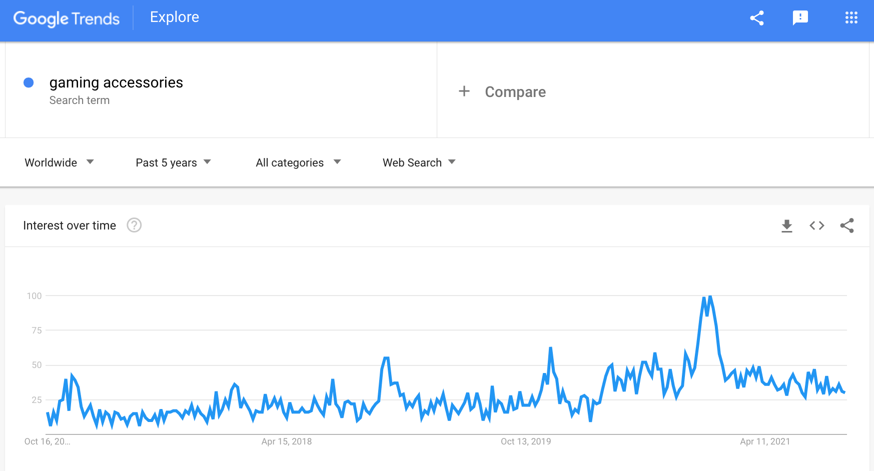 The last, but not least promising niche with low competition is gaming accessories. The era of pandemics and total lock-downs put new life into an already popular niche. Now consumer spending on video game content amounts to over 50 billion U.S. dollars. This is evident from the number of search requests.